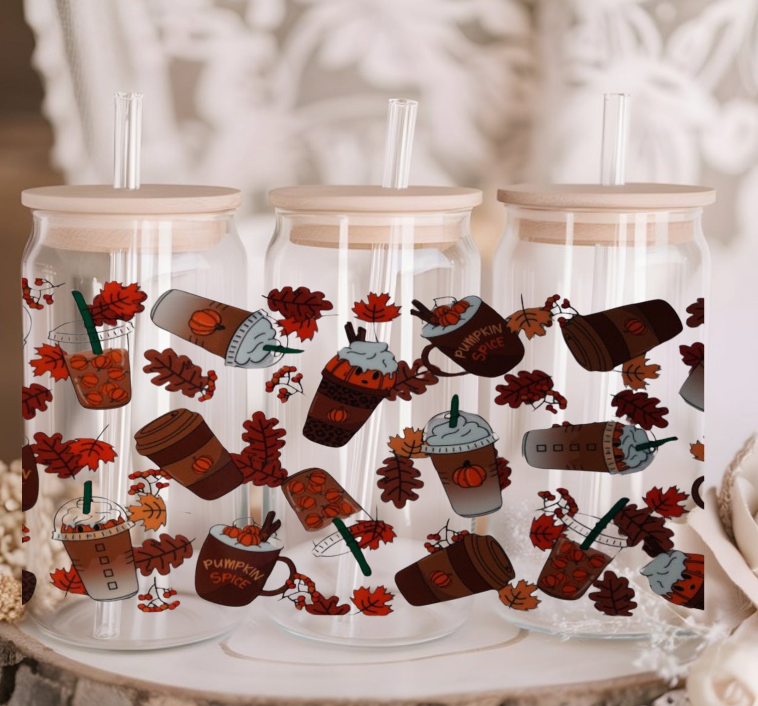 Celebrate the cozy vibes of fall with this beautifully designed 16oz cup, available in both glass can and stainless steel styles. Featuring a fun autumn themed pattern of pumpkin spice lattes, iced coffee, and fall foliage, this cup is perfect for coffee lovers who can’t get enough of their seasonal drinks. Complete with a bamboo lid and reusable straw, it’s stylish, practical, and eco-friendly perfect for sipping on your favorite warm or iced beverages all season long!