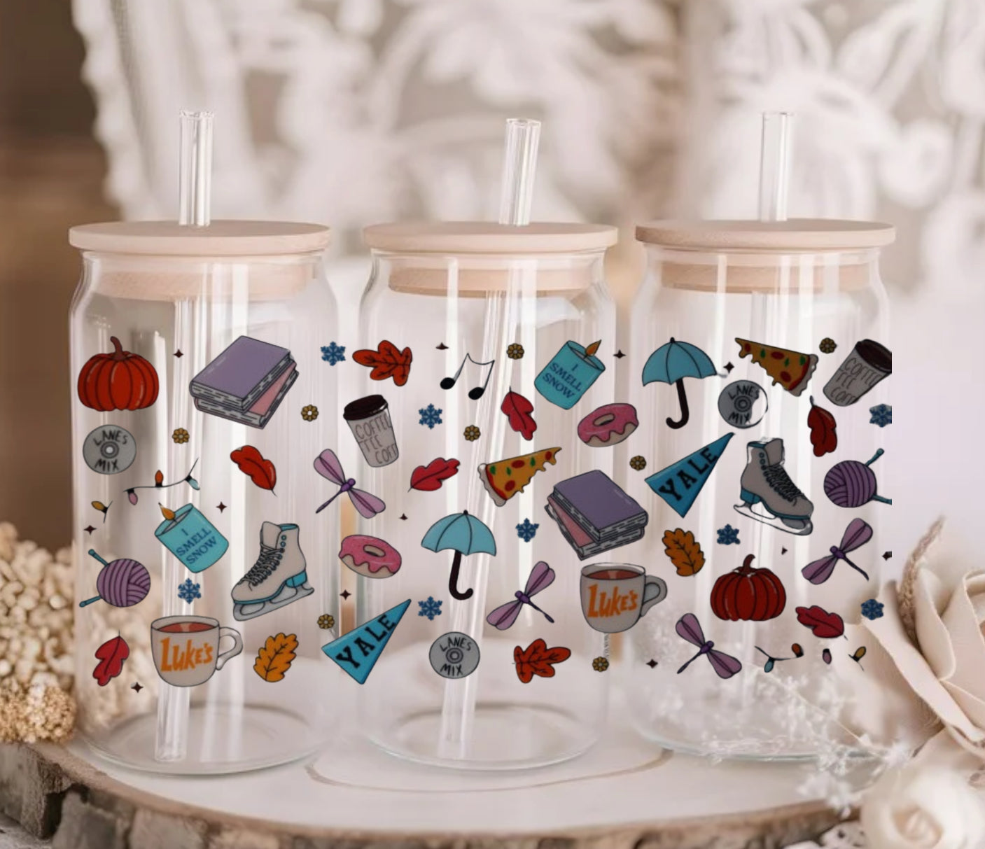 Whether you choose a stainless steel tumbler or a glass can cup, both are 16 ounces and perfect for your favorite drinks. This glass can cup features a charming design inspired by cozy coffee shop vibes, books, autumn leaves, and nostalgic elements like Lukeâ coffee cup, Yale pennant, ice skates, and more. The cup comes with a bamboo lid and a reusable straw, making it a stylish and eco-friendly choice for coffee lovers, bookworms, and fall enthusiasts. Ideal for sipping iced coffee, tea, or hot chocolate in style!