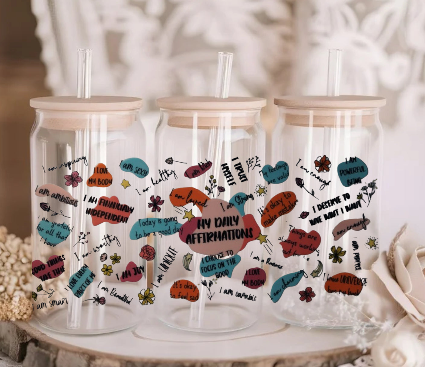 Whether you choose a stainless steel tumbler or a glass can cup, both hold 16 ounces of motivation and positivity! This beautifully designed cup is covered in uplifting affirmations like I am worthy, I am strong, and I choose to focus on the good, making it a perfect daily reminder to embrace self-love and confidence. The colorful hearts, flowers, and playful typography add a charming touch. Complete with a bamboo lid and reusable straw, this cup is ideal for your favorite beverages, whether you’re sipping iced coffee, tea, or a refreshing smoothie. Stay inspired with every sip!