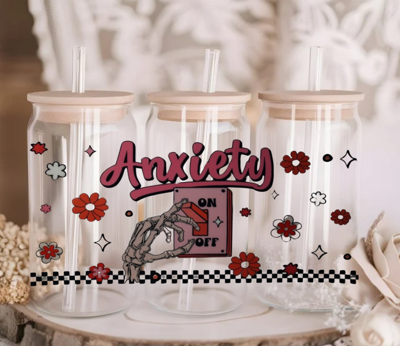 Find a moment of calm with our 16oz Anxiety On/Off cup, available in both glass can and stainless steel options. Featuring a bold and artistic design with a skeleton hand flipping an On/Off anxiety switch, floral accents, and a checkered pattern, this cup is perfect for those who embrace self-awareness and mental health themes. Comes with a bamboo lid and reusable straw, making it a stylish and functional choice for your favorite drinks.