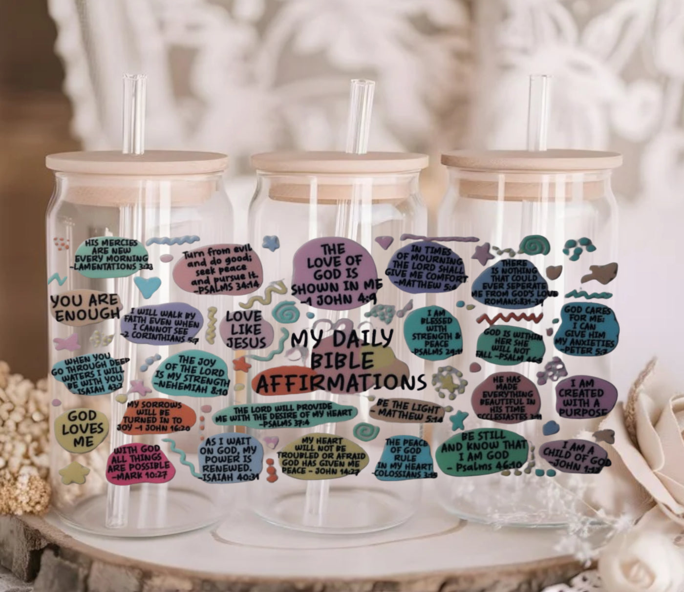 Start each day with faith and positivity with this 16oz cup, available in both glass can and stainless steel options. Featuring uplifting Bible affirmations and scripture based reminders of God’s love, strength, and guidance, this cup is perfect for anyone seeking daily encouragement. With a bamboo lid and reusable straw, it’s ideal for sipping your favorite drinks while keeping your heart centered on faith. A thoughtful gift for believers, church members, or anyone who enjoys scripture inspired motivation!
