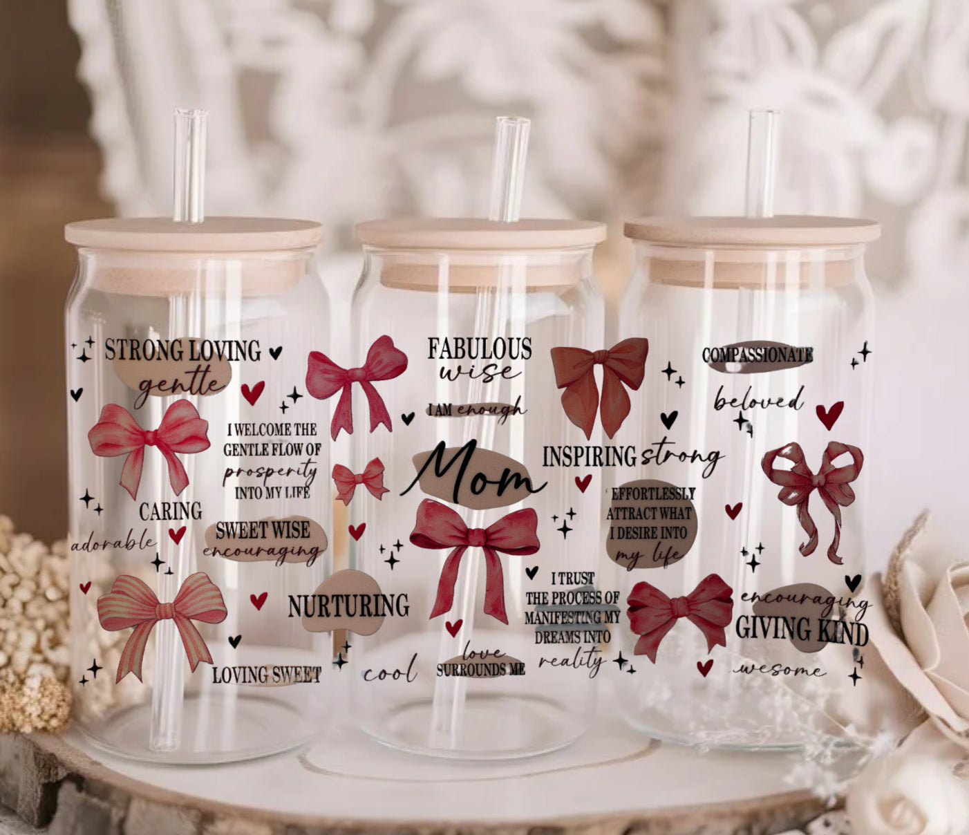 Celebrate the strength, love, and wisdom of motherhood with this beautifully designed 16oz cup, available in both glass can and stainless steel options. Featuring heartfelt affirmations and delicate bow accents, this cup is a perfect reminder of the nurturing, compassionate, and inspiring qualities that make moms so special. Comes with a bamboo lid and reusable straw, making it a stylish and practical gift for Mother’s Day, birthdays, or any occasion to show appreciation for the amazing moms in our lives!