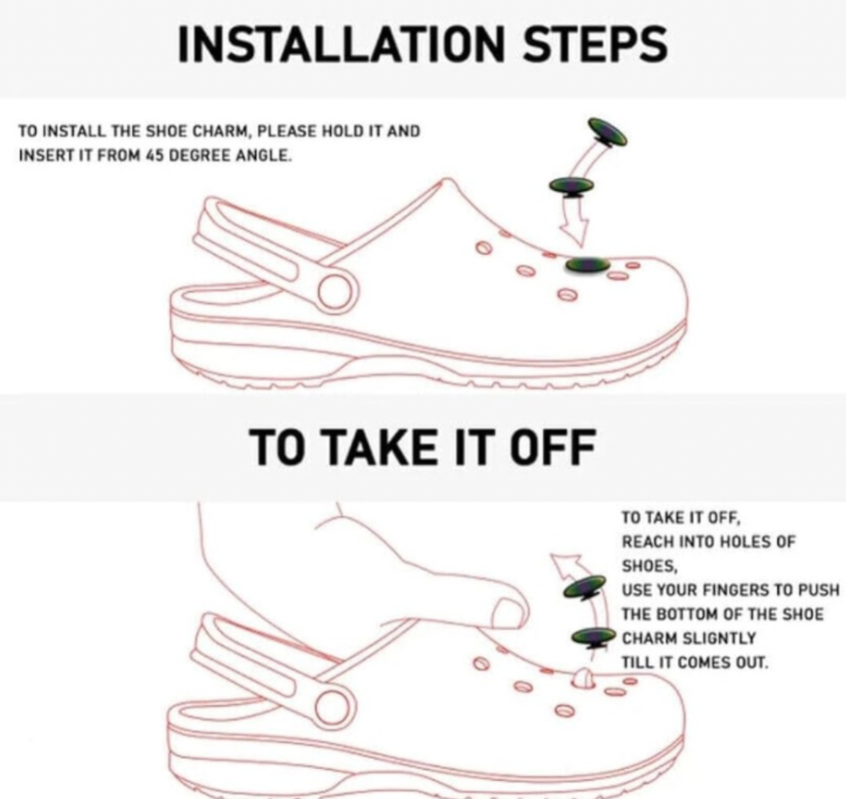 Removal: Reach inside the shoe and gently push the bottom of the charm upward until it pops out.